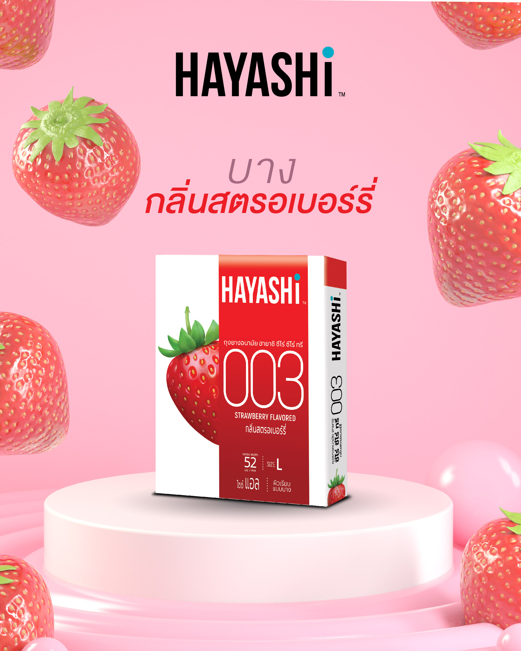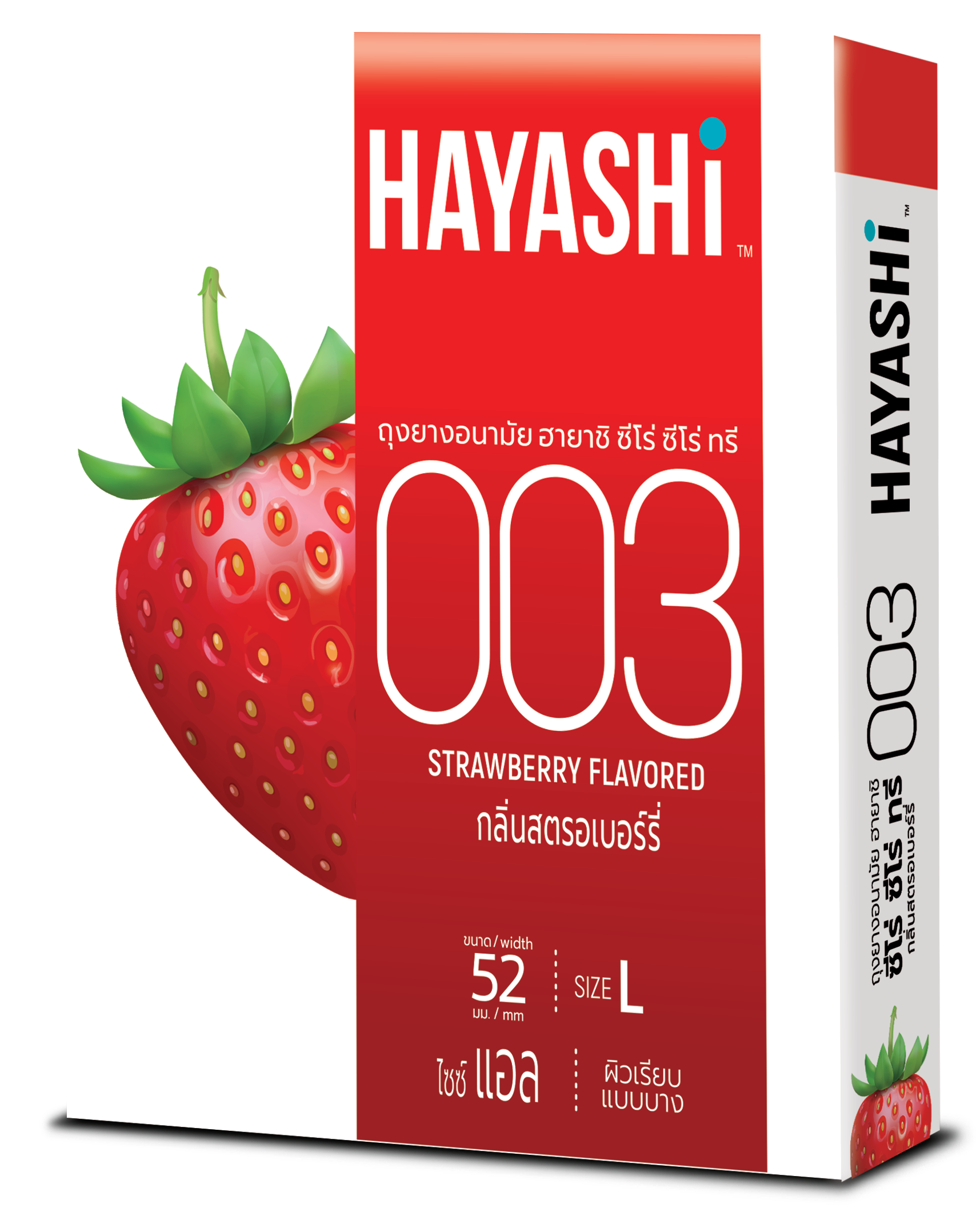 ถุงยางอนามัย ฮายาชิ ซีโร่ ซีโร่ ทรี 003 กลิ่นสตรอเบอร์รี่(บางที่สุดในกลุ่มถุงยางอนามัยกลิ่นสตรอเบอร์รี่) ถุงยางอนามัยผลิตจากยางธรรมชาติ ขนาด 52 มม. ไม่เจือสี บางพิเศษเพียง 0.03 มม. ผิวเรียบ กลิ่นสตอเบอร์รี่ ยืดหยุ่นสูงทำให้คุณรับรู้ทุกการสัมผัส ช่วยให้เข้าถึงสัมผัสที่นุ่มนวลเร้าอารมณ์ไปพร้อมกับกลิ่นที่หอมหวาน เพราะความบางจนรู้สึกเหมือนไม่ได้ใส่ บางที่สุดของถุงยางที่ทำจากยางธรรมชาติ