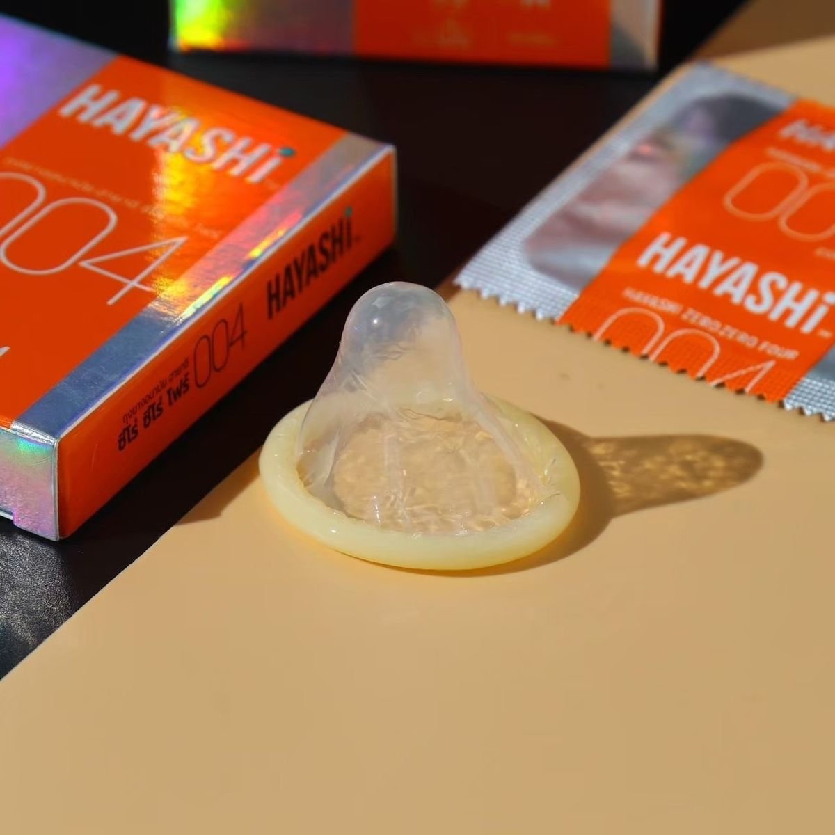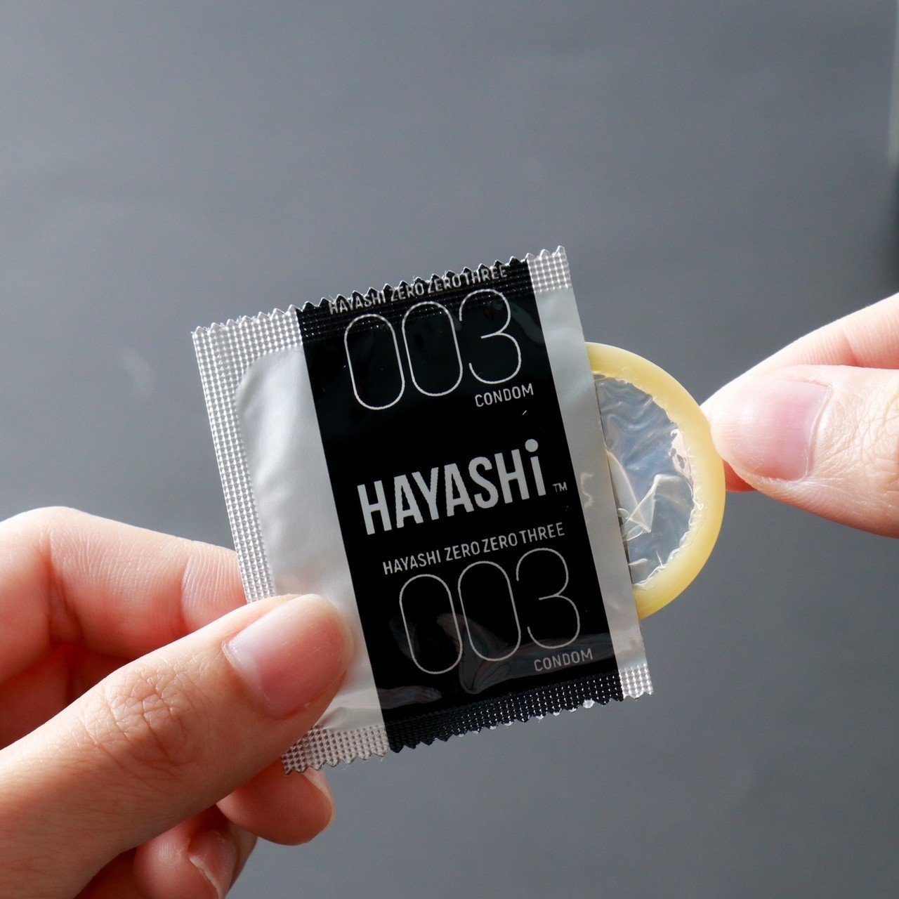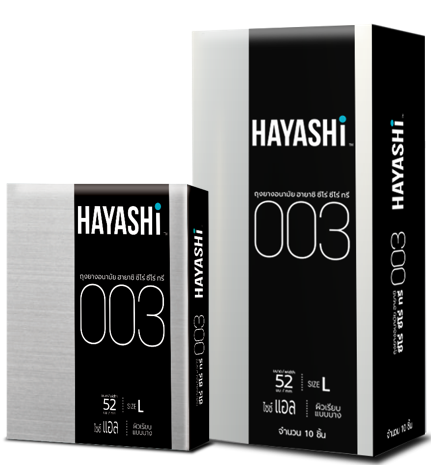 ฮายาชิ 003 มี 2 แบบให้เลือก กล่องเล็กบรรจุ 2 ชิ้น และ กล่องใหญ่บรรจุ 10 ชิ้น ที่มาในแพ็กเกจโทนสีดำ หรูหรา รุ่นนี้จะเหมาะกับขนาด 52 มม. ไซส์ L เนื้อสัมผัสเรียบ แบบบางเฉียบ บางเหมือนไม่ได้ใส่ ผิวสัมผัสนุ่มนวล พร้อมเจลหล่อลื่นในตัว ลดการเสียดสี ไม่ขาดง่าย ไม่มีกลิ่นยาง เพราะผลิตจากยางธรรมชาติ คุณภาพได้มาตรฐาน ปลอดภัย